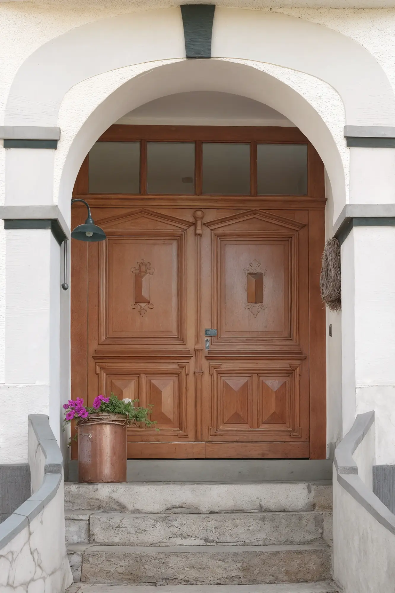 Exklusive Gründerzeit-Haustür mit handwerklichen Verzierungen, Oberlicht und moderner Sicherheitstechnik.