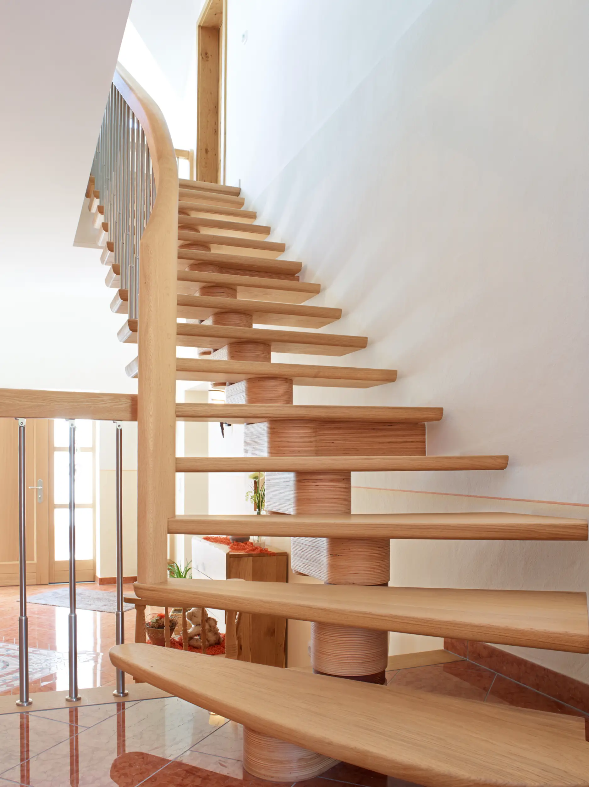 Die exklusive gezogene Mittelholmtreppe besticht durch ihre besondere Konstruktion und hochwertige Verarbeitung. Die Stufen und der Handlauf aus massivem Bucherholz verleihen der Treppe natürliche Eleganz und Langlebigkeit. Vertikale Geländerstäbe aus Edelstahl setzen moderne Akzente und sorgen für ein offenes, luftiges Raumgefühl.