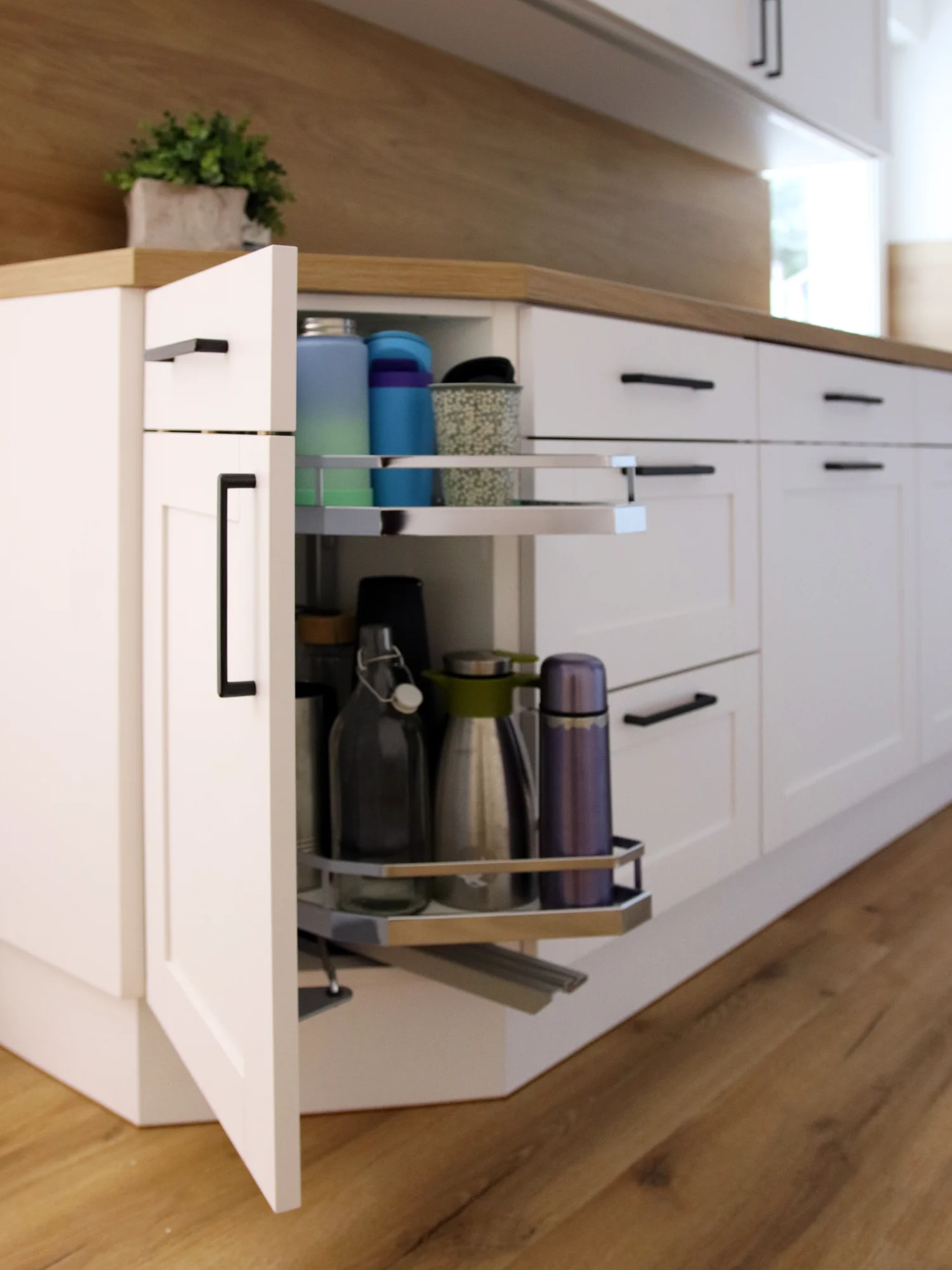 Diese Landhausküche verbindet zeitlose Eleganz mit moderner Funktionalität. Die mattweißen Fronten verleihen dem Raum eine helle, freundliche Atmosphäre, während die Arbeitsplatte in warmem Holzdekor einen natürlichen Akzent setzt. Das Bora-Induktionskochfeld mit integrierter Abluft sorgt für freie Sicht und ein ruhiges, aufgeräumtes Küchendesign.