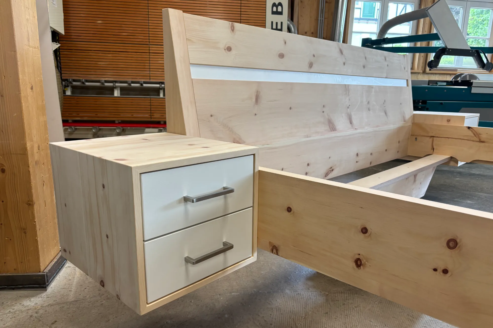 Dieses massive Zirbenbett besticht durch seine zeitlose, moderne Gestaltung mit lösbarer, echter Fingerzinkung als Eckverbindung. Eine Leichtigkeit wird durch schwebenden Wirkung des Bettes und weißen matten Flächen erreicht. Zwei hängende Nachttische runden das Bild ab.