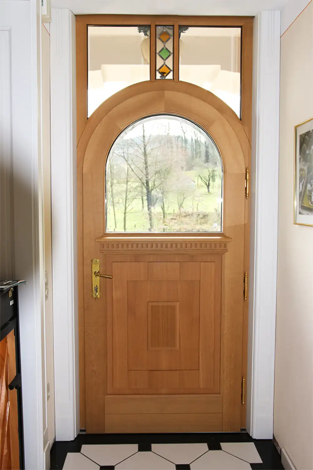 Exklusive Gründerzeit-Haustür mit handwerklichen Holzverzierungen, Oberlicht und moderner Sicherheitstechnik.