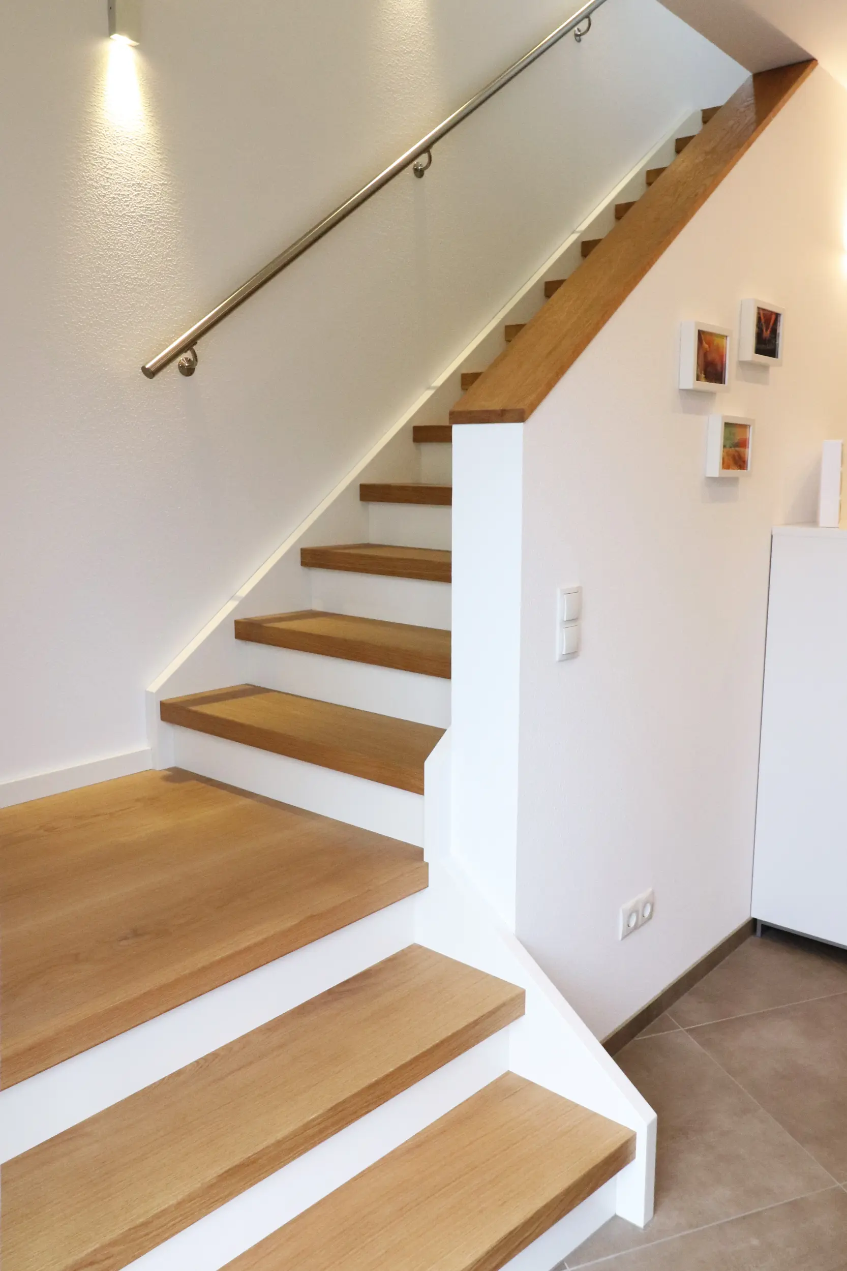 Die zweiläufige Landhaustreppe besticht durch ihre weiß lackierten Wangen und geschlossenen Setzstufen, die den Raum unter der Treppe gut nutzbar machen. Statt eines Geländers schützt die angrenzende Wand als natürliche Absturzsicherung. Ein schlichter Handlauf aus Edelstahl ist an der Wand befestigt und sorgt für Sicherheit beim Auf- und Absteigen.