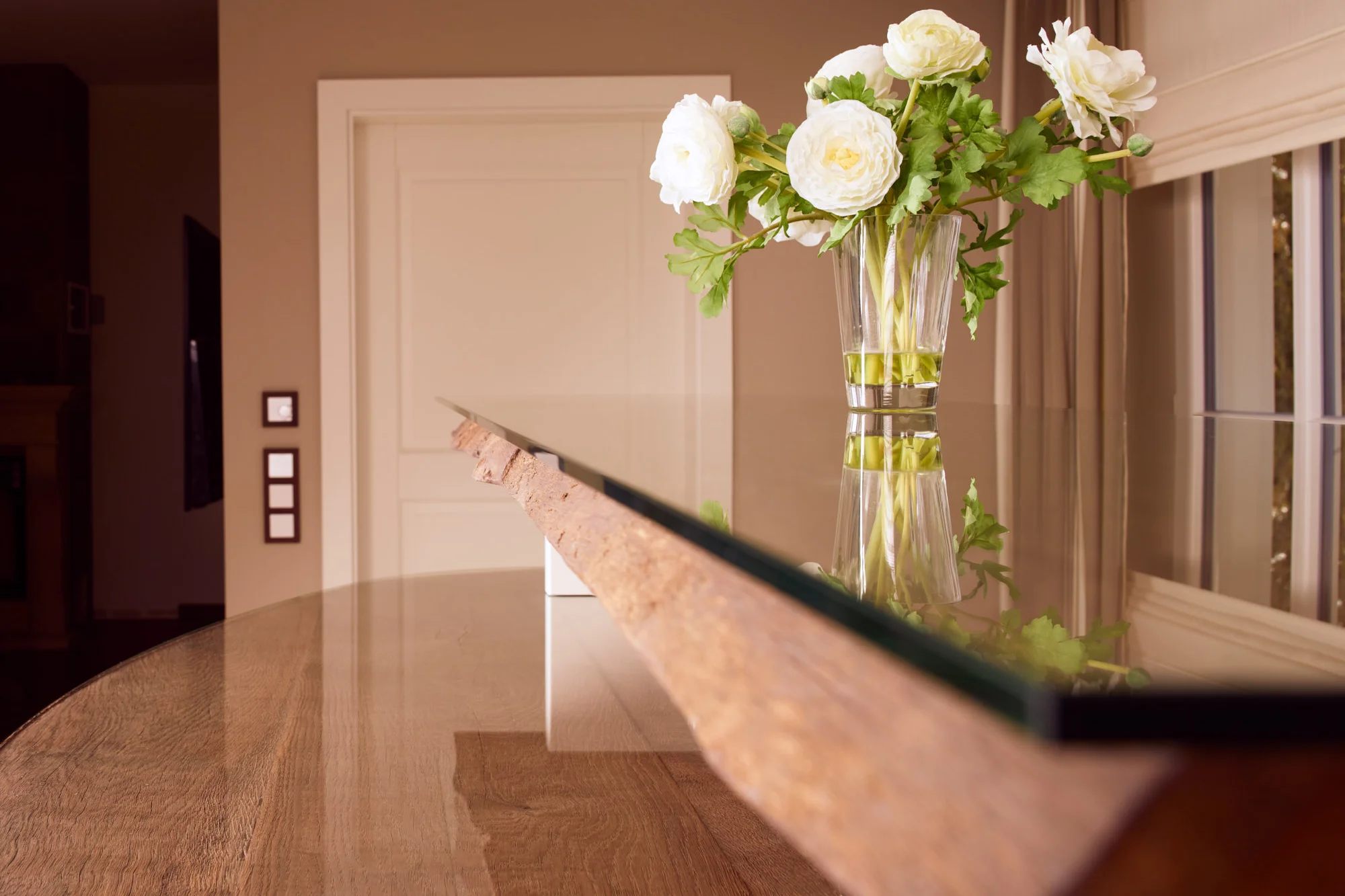 Eine Glasabdeckung und die klar gegliederte Form unterstreichen den gepflegten, hochwertigen Charakter dieser Serviertheke.
