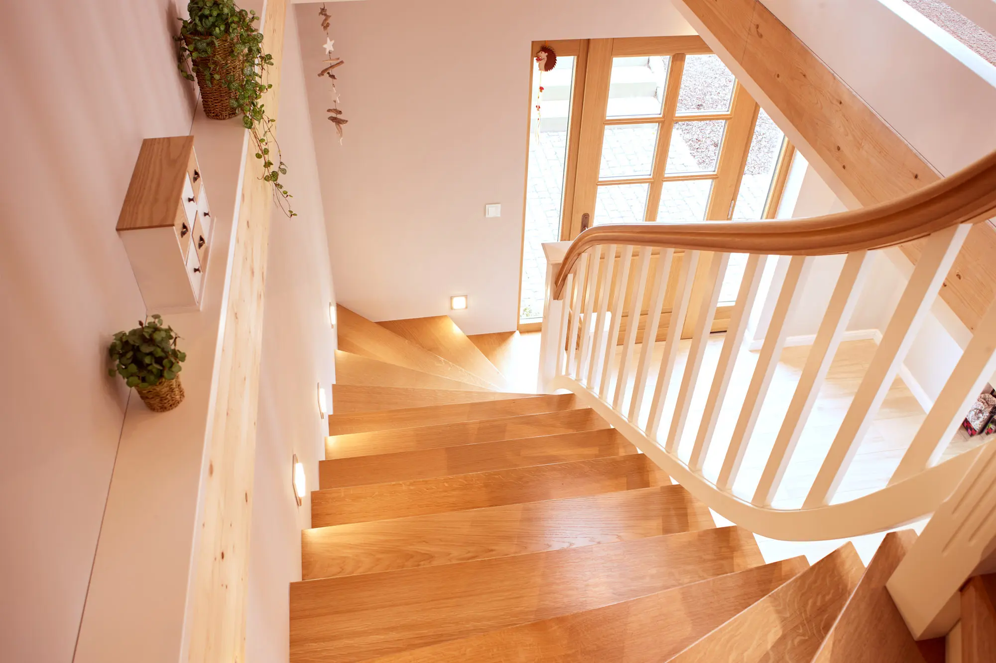 Die klassische Treppenanlage besticht durch weiß lackierte Wangen und massive gezogenen Eichenstufen, die Wärme und Natürlichkeit ausstrahlen. Ein verzierter Antrittspfosten mit elegantem Kapitell setzt einen stilvollen Akzent und unterstreicht den Landhausstil der Treppe.