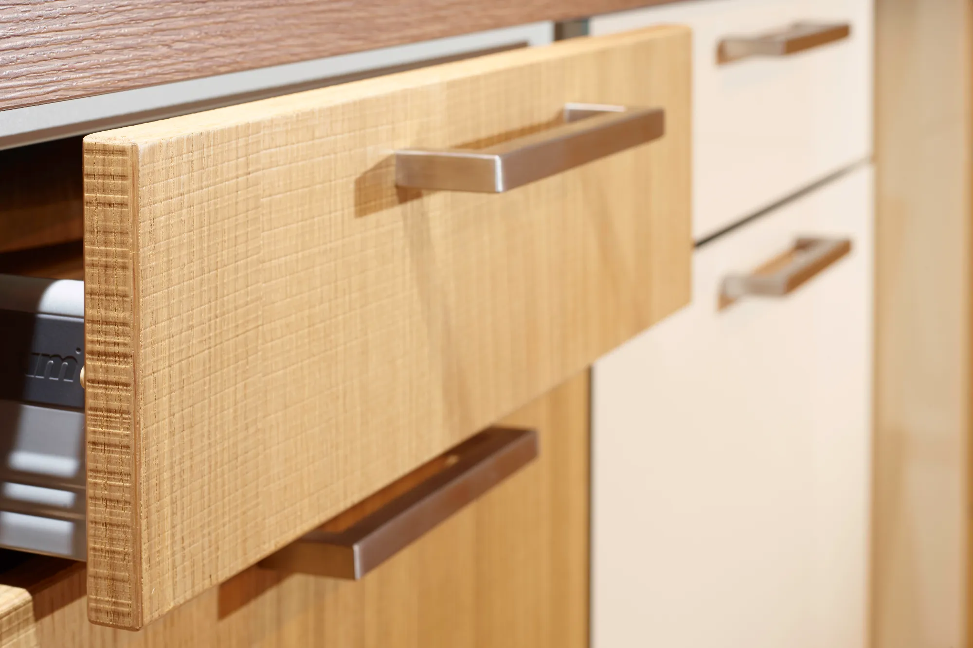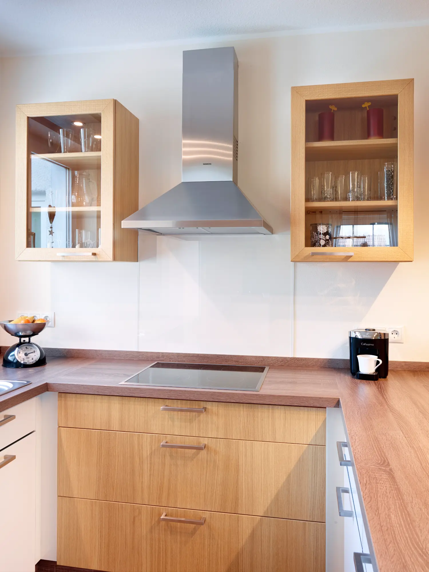 Hochwertige Glaskanten verleihen den Fronten eine edle Note und unterstreichen die klare Linienführung. Das Lampenboard mit integrierten LED-Spots im Arbeitsplattendekor sorgt für optimale Beleuchtung und setzt stilvolle Akzente. Die Oberschränke mit Glasfüllung schaffen Leichtigkeit und bieten zugleich praktischen Stauraum. So entsteht eine Küche, die traditionellen Charme mit zeitgemäßem Design perfekt vereint.