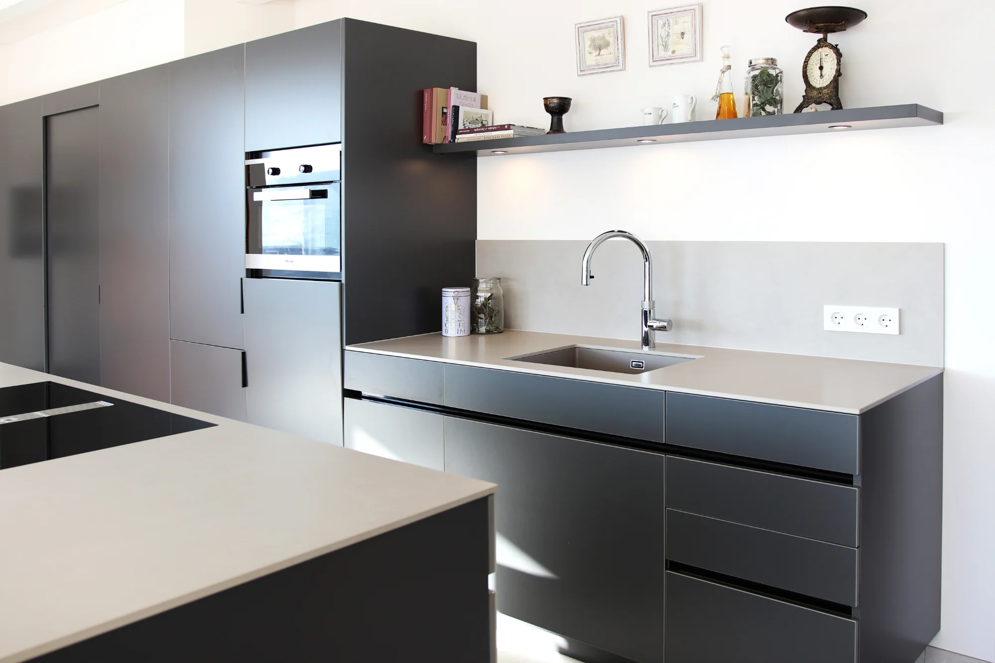 Entwurf und Fertigung einer hochwertigen in sich Stimmigen Einbauküche in grau. Ihre Küche – geplant und gefertigt aus einer Hand.