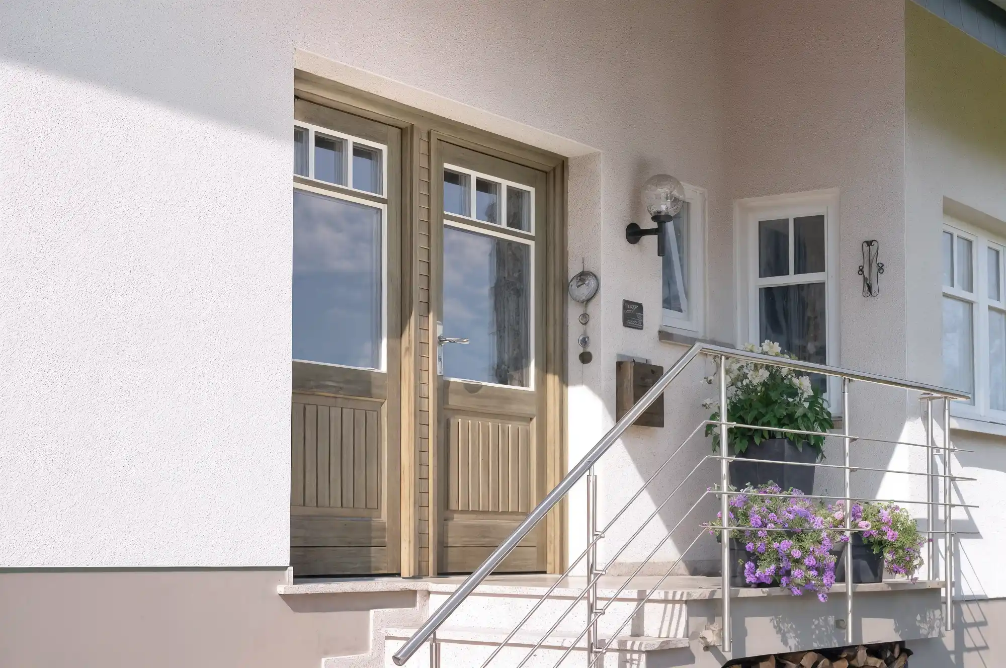 Die zweiteilige Haustür im Landhausstil überzeugt durch große Glasfüllungen, die viel Tageslicht ins Haus lassen. Wärmegedämmte Füllungen sorgen für optimale Isolierung und Energieeffizienz.
