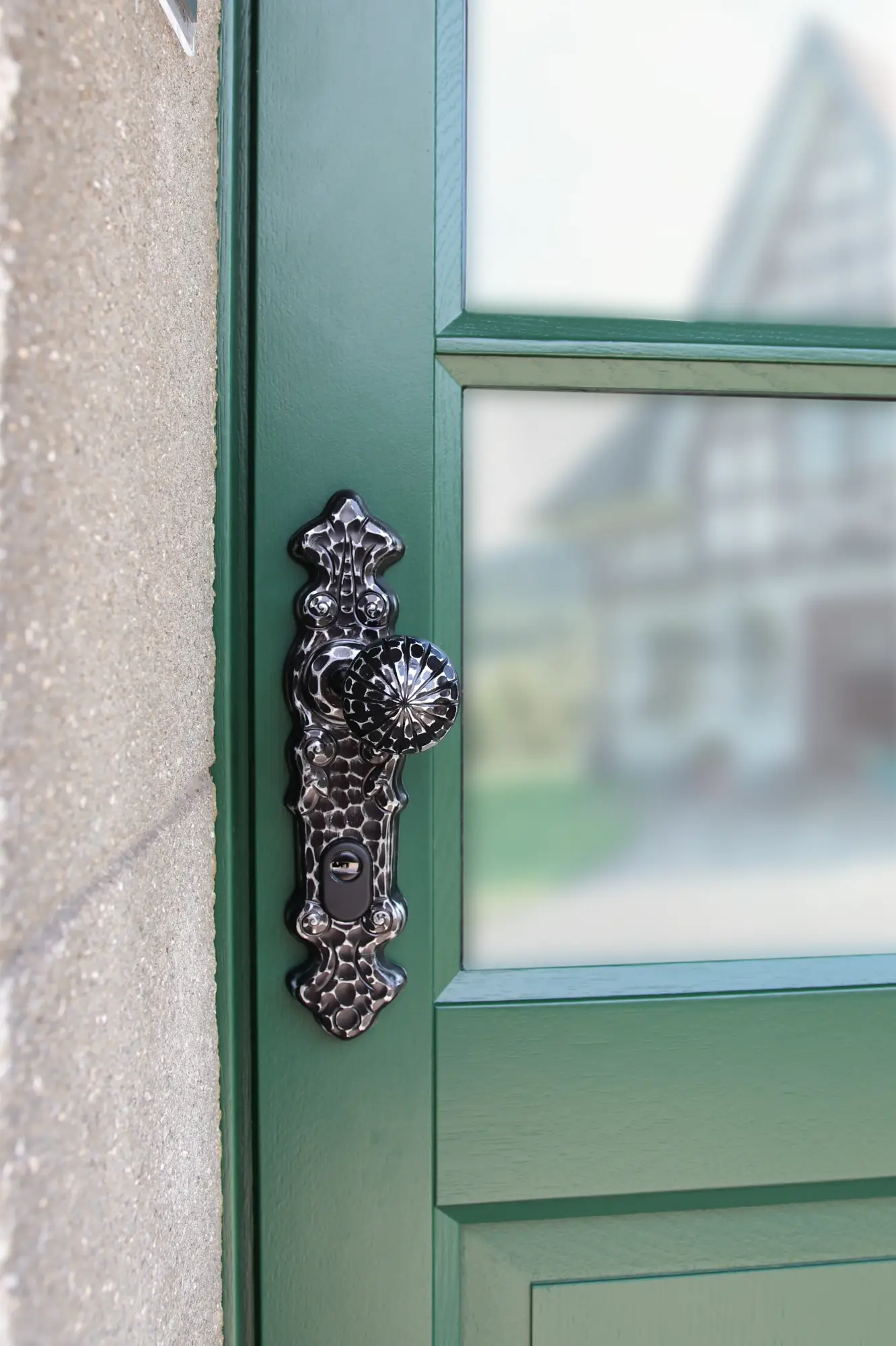 Massive Landhaustür aus Eiche mit grüner Lasur, 3-fach Verglasung und sichtbarer Holzstruktur.