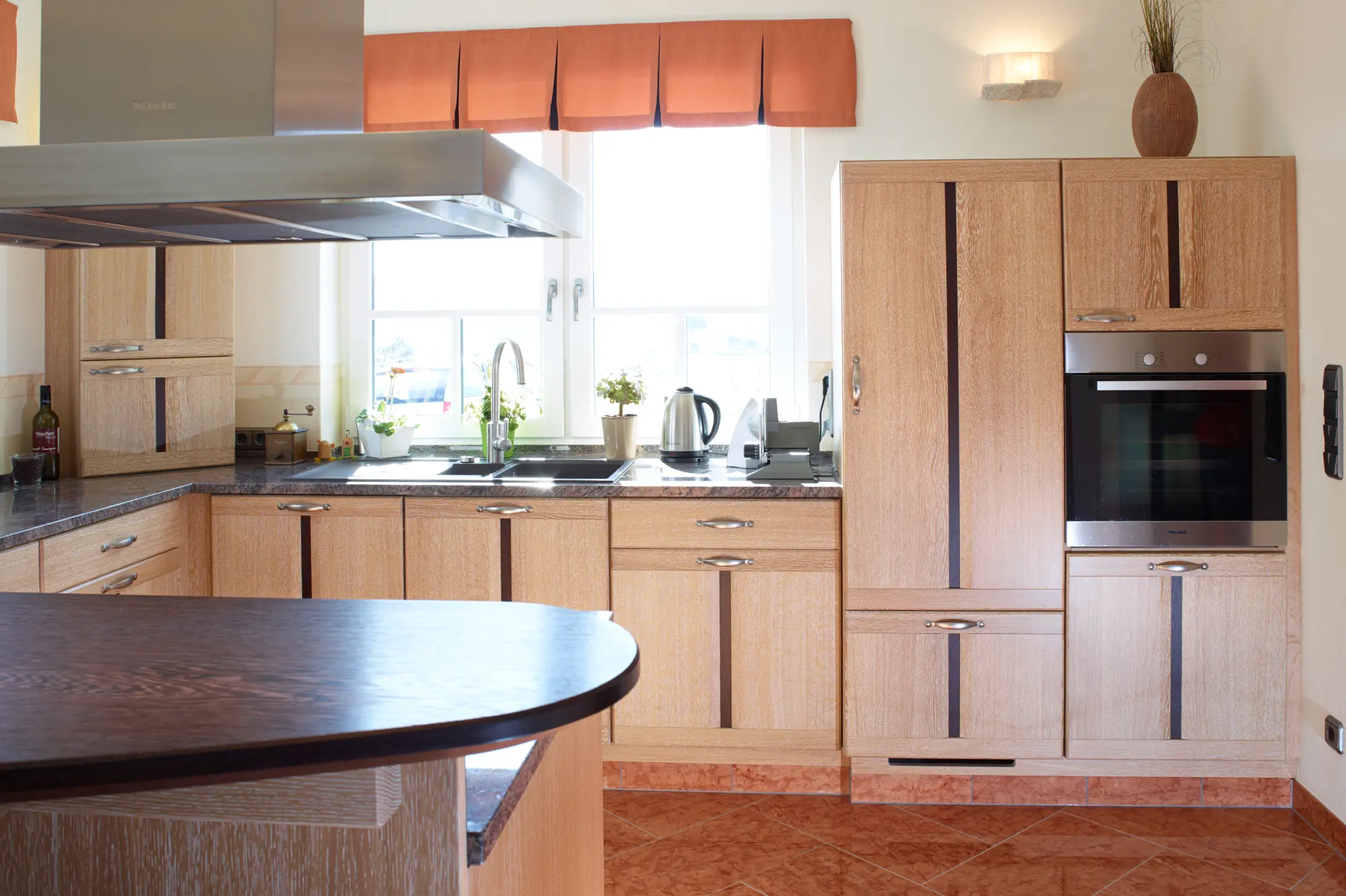 Die Landhausküche besticht durch massive Vollholzfronten aus gekälkter und lackierter Eiche. Die klassischen Füllungsfronten unterstreichen den traditionellen Charakter, während die hochwertige Verarbeitung für Langlebigkeit sorgt.