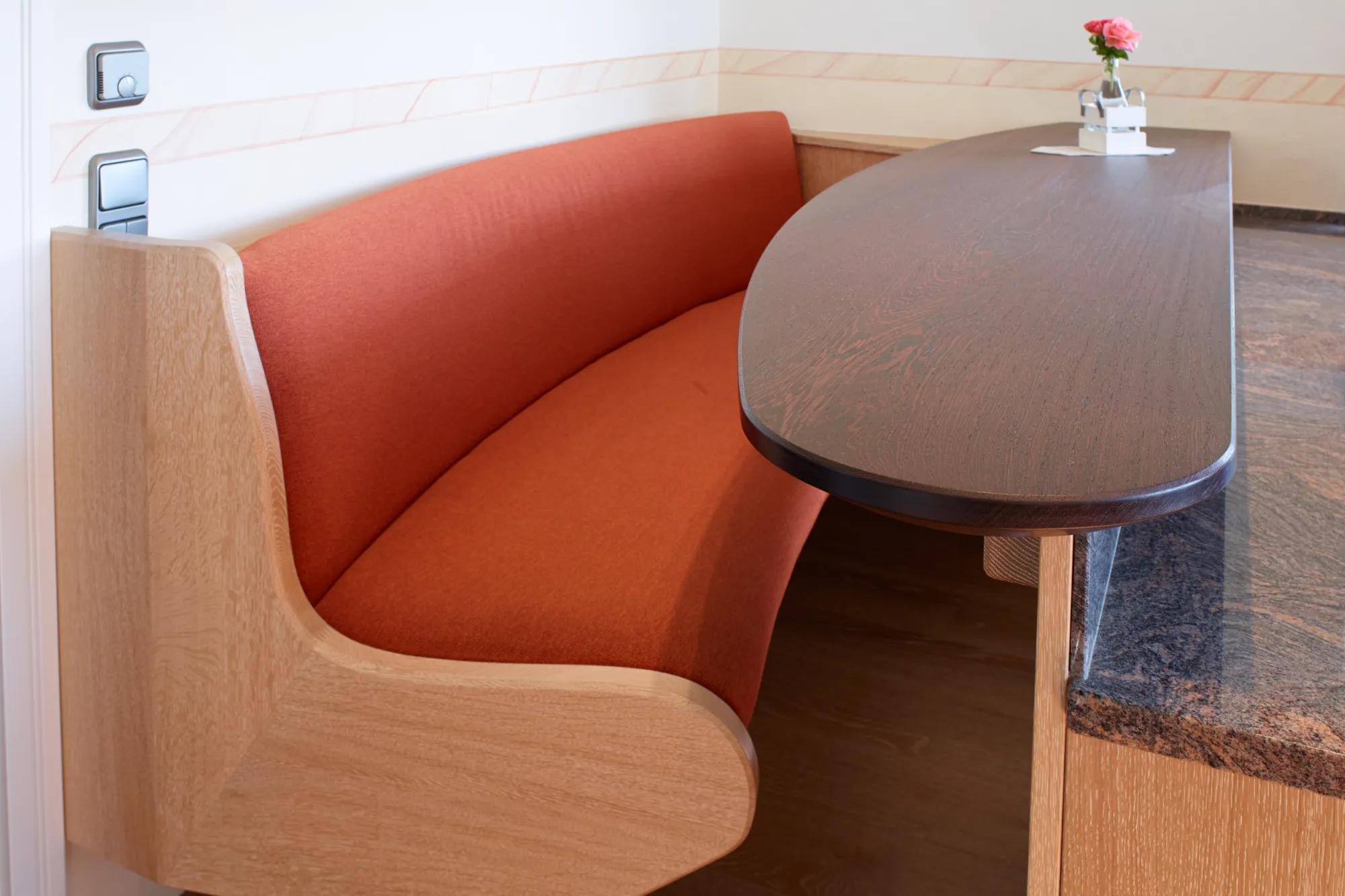 Ein besonderes Highlight ist der Mittelteil mit einer Einlage aus massivem Wengeholz, der einen stilvollen Kontrast zur Eiche bildet. Der Thekentisch aus massivem Wenge rundet das Gesamtbild ab und schafft eine einladende Atmosphäre zum Verweilen. Durch die Kombination edler Hölzer entsteht ein harmonisches Zusammenspiel von rustikalem Charme und modernem Design.