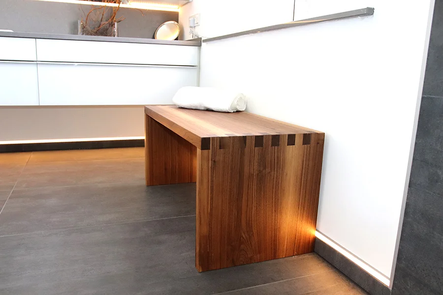 Ergänzt wird das Ensemble durch eine massive Sitzbank aus geöltem Nussbaum, deren präzise Zinkenverbindung das handwerkliche Können sichtbar macht. Das Zusammenspiel aus warmem Holz, klaren Flächen und durchdachter Lichtführung schafft eine moderne, hochwertige Atmosphäre – gestaltet und gefertigt bis ins Detail aus einer Hand.